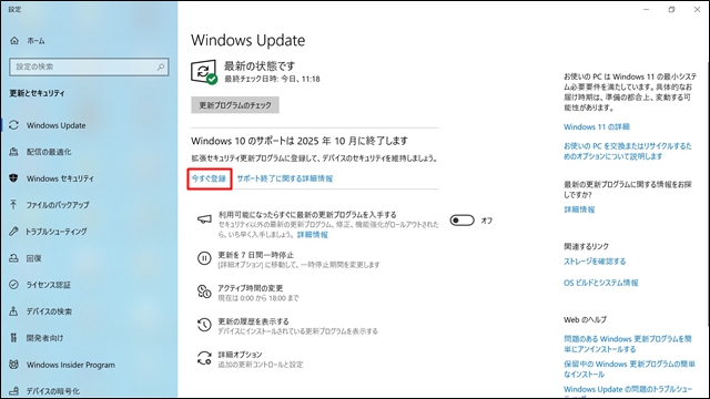 Windows Update画面に表示されている「今すぐ登録」をクリックします。