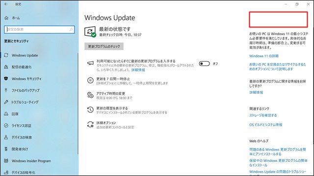 本来なら赤で囲ったところに「おめでとうございます。お使いのパソコンはWindows11に対応しています。」といった文言が記載されていてWindows11にアップグレードするボタンが表示されているはずですが、状況によっては表示されてないことがあります。