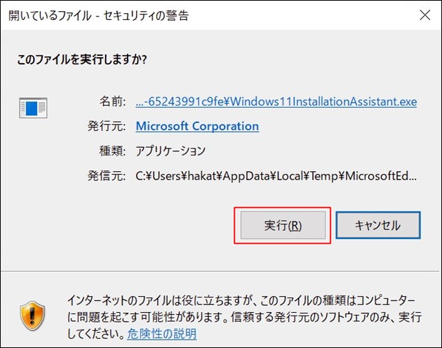 一番上の「今すぐダウンロードする」ボタンをクリックしてファイルのダウンロードが終わると出てくるダイアログの「実行」ボタンをクリックします。
