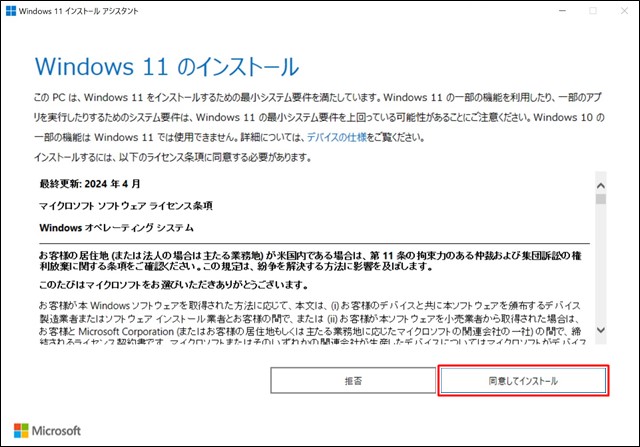 次にライセンス条項などに目を通して「同意してインストール」をクリックします。